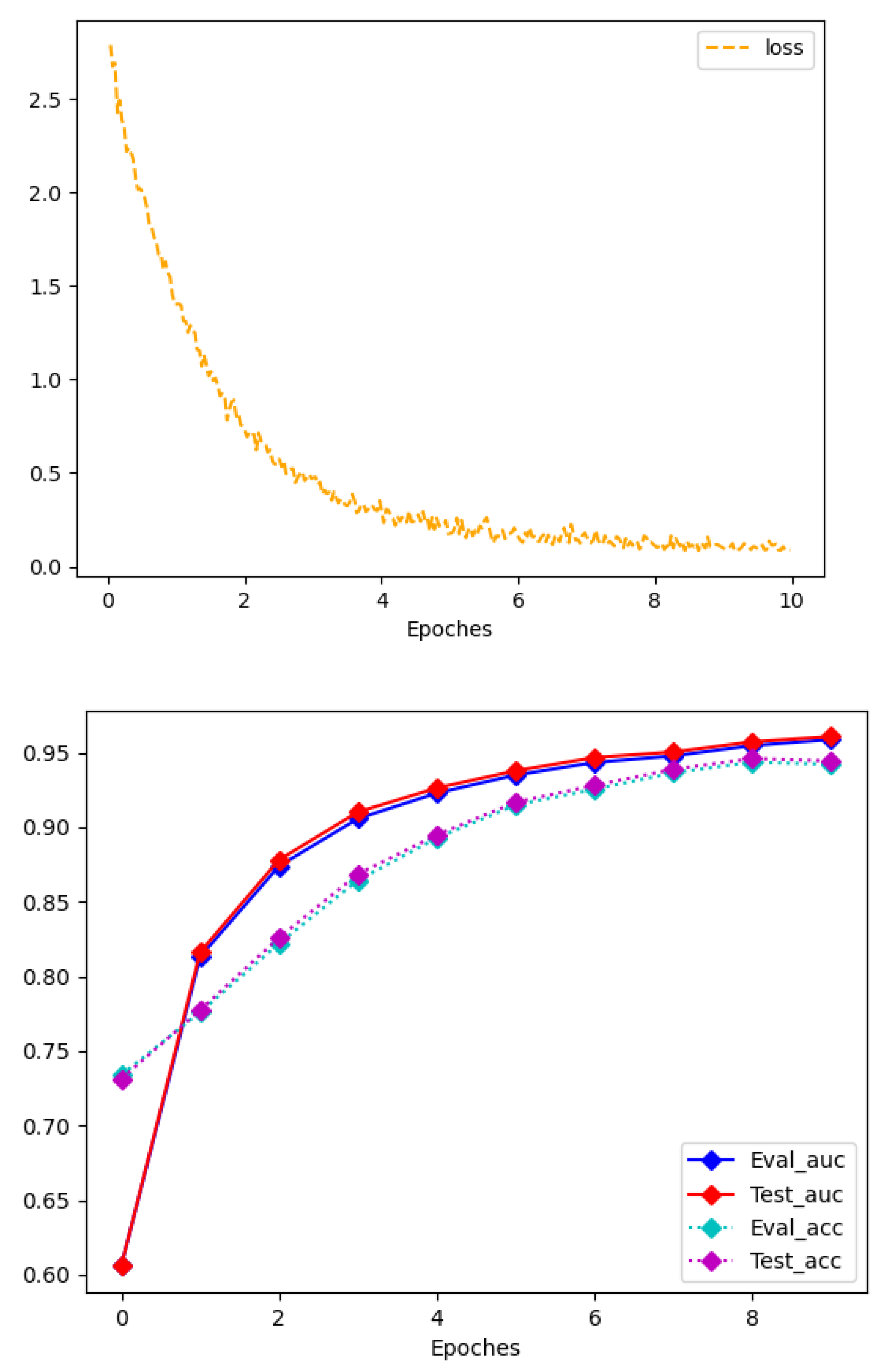 Figure 9 shows the ACC and AUC of the network under different H values after 10 training rounds. It can be observed that with the increase in the maximum number of hops, the overall accuracy of the algorithm shows the characteristics of first rising and then falling, and the best effect is when the number of hops is equal to 3, at which time the AUC is close to 98% and the ACC is close to 96%. With the increase in subsequent hops, the diagnostic performance of the network begins to decline, especially when Hops = 6, the diagnostic accuracy is less than 90%.