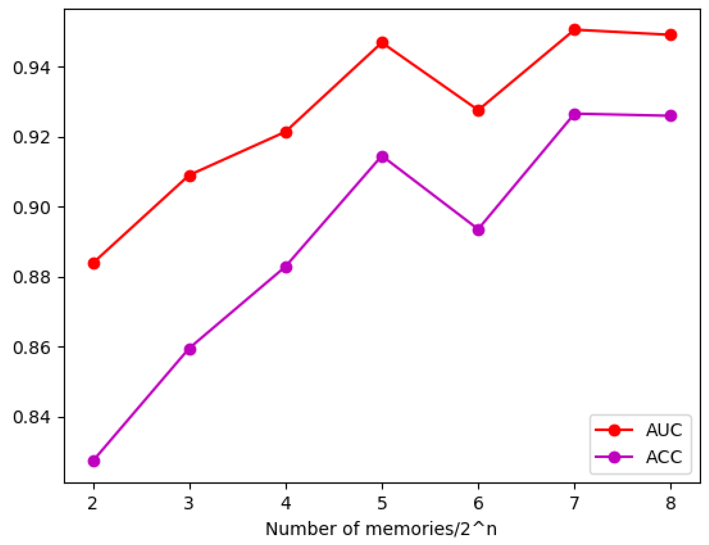 Figure 10, after 10 training rounds, the ACC and AUC of the network were under different numbers of ripple set screening. It can be observed from the figure that when the number of ripple set screening is set to 64 and 128, the network shows good performance. The AUC of both networks is above 94%, and the ACC is about 91.2% and 92.1%, respectively. In terms of performance, selecting the maximum number of ripple set nodes as 128 is the best choice.