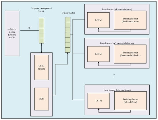 As illustrated in Figure 1, the GMM-SCM-DCM model comprises three steps. The first step subjects cellular traffic payload data to processing through operations such as the Fast Fourier Transform (FFT) to derive the traffic feature frequencies for each cellular network, which are then used to train GMMs. The second step feeds the frequency–domain features of new traffic tasks into the DCM for novelty detection. If the traffic pattern is identified as existing, the SCM mechanism assigns initial weights and executes the prediction task. If the pattern is classified as a similar pattern, it provides similarity weights and then fine-tunes using a fine-tuned dataset. If the pattern is classified as a completely new traffic pattern, a new component must be created; this step is termed component splitting. The third step utilizes the soft weights produced by the GMM to select an appropriate base learner for network traffic load prediction.