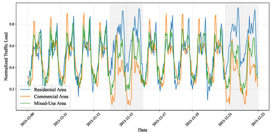 - Data normalization: The traffic load was normalized to the range [0, 1] using the Min-Max algorithm. The normalized sequences distinctly reveal the diverse traffic patterns exhibited by cells across different functional zones. As illustrated in Figure 2, three representative cells display markedly different temporal characteristics during identical time periods, demonstrating the significant impact of functional differentiation within urban spaces on communication behavior. Residential areas exhibit stronger evening peak pulses (18:00–21:00), with a notable increase in baseline traffic throughout weekends. Commercial districts exhibit sharper morning peak traffic (8–11 a.m.) with markedly reduced weekend volumes. Mixed-use areas display distinct dual peaks during morning and evening hours, exhibiting moderate weekend effects.