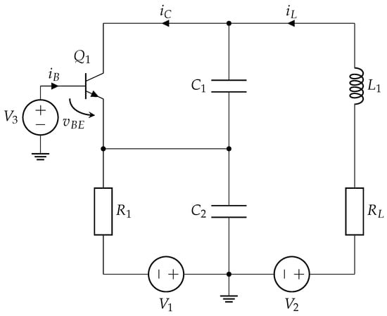 Commonly employed for radio frequency (RF) signal generation, the Colpitts oscillator exhibits chaotic behavior under certain component values [11,22,23]. The schematic of a Colpitts oscillator demonstrating chaotic dynamics is shown in Figure 1. This oscillator consists of a bipolar junction transistor (BJT) operating in its active region, along with an inductance and a capacitive divider, formed by and and providing positive feedback to sustain oscillations. The inductor , in series with its internal resistance , together with a bias resistor , completes the circuit loop. The DC supply voltages and provide proper biasing for the transistor.