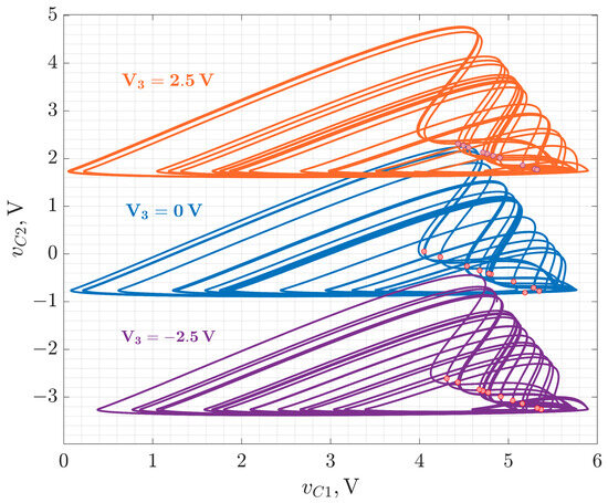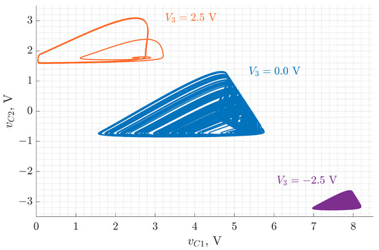 Figure 3 represents the phase portraits of the system, corresponding to three different values of V. It could be clearly seen that the introduction of additional biasing voltage to the transistor base, according to Model (5), does not cause significant qualitative changes in the system’s dynamics. The attractor shifts along the y-axis, demonstrating the well-described offset-boosting effect [24].