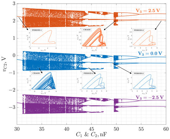 Figure 4 presents a set of bifurcation diagrams of the modified Colpitts oscillator obtained by varying the capacitors and values in the range of 30 nF to 60 nF. The results are shown for three different bias voltage values: V.