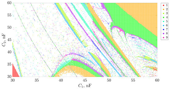 It should be noted that in the analysis, it is assumed that both capacitors are degrading at the same rate, which could not be the case in real circuitry. Thus, it would be valuable to identify the dependence of the system’s dynamics for a wide range of and combinations. This can be represented as a two-dimensional bifurcation diagram (Figure 5), where and are chosen as bifurcation parameters and colors indicate periodic or chaotic modes of operation.