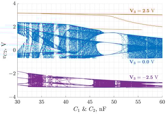 A set of bifurcation diagrams was generated by launching LTspice simulations from within the MATLAB environment to investigate the influence of capacitor values on the oscillator’s behavior. This approach allowed automated sweeping of and from 30 nF to 60 nF for three different DC bias voltages: V. The state variable was extracted from each simulation after transient effects subsided and used as the bifurcation observable. The resulting diagrams are shown in Figure 7.