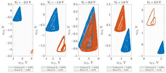 The 0–1 test for chaos (Z1TEST) was applied to the measured voltage signals to quantify these changes [25], and the resulting -values are shown in the figure legend. The test numerically evaluates the degree of chaotic behavior, with values closer to 1 indicating stronger chaotic behavior but values closer to 0 indicating periodic behavior. The results confirm that the biased configurations exhibit reduced or suppressed chaotic dynamics for extreme values, aligning with the observed attractor deformation.