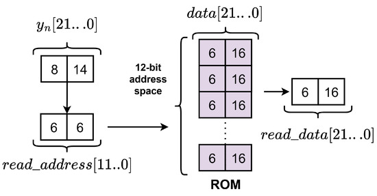 The design of the memory is depicted in Figure 11. The system is designed in fixed-point arithmetic with an 8-bit-wide integer part and a 14-bi-wide fractional part of the output state variables. The ROMs have a 12-bit address space and store 6-bit-wide integer 16-bit-wide fractional part data. The read address in both ROMs is formed from the state variable by taking 6 integer bits and 6 fractional bits.