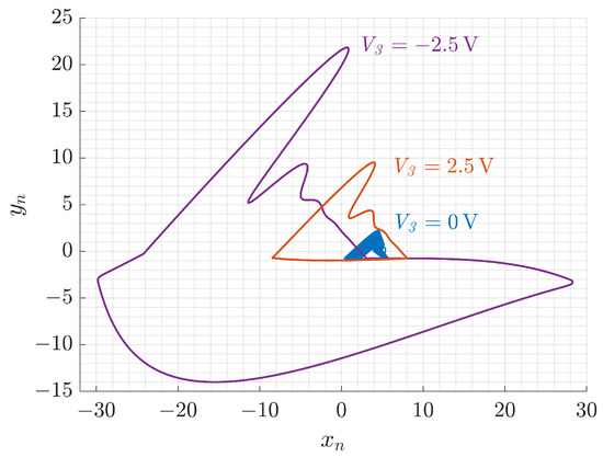 The digital design of the Colpitts chaotic oscillator with added base-bias voltage is verified in MATLAB 2023b. Figure 12 presents the – (reflects the –) phase trajectories for three values of the DC bias voltage V. The phase portrait illustrates a completely different behavior of the oscillator model with the applied compared to that shown in Figure 6. This can be attributed to the simplified mathematical model of the transistor considered initially.