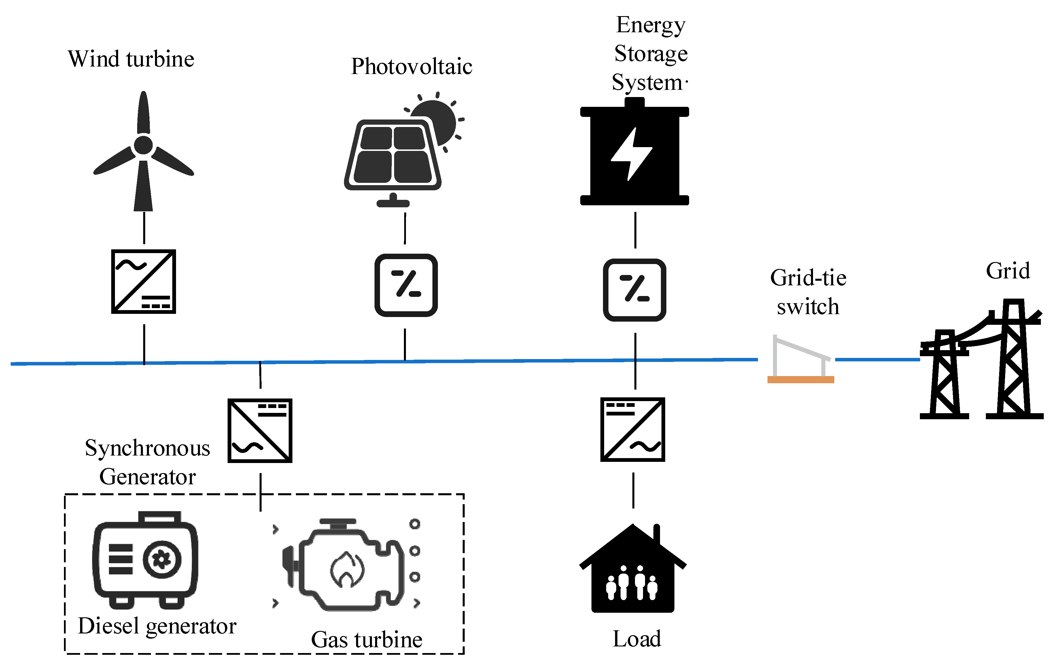 The frequency behavior of a microgrid depends on the types of sources and loads it comprises. Synchronous generator units exhibit pronounced frequency-droop characteristics and load regulation effects, whereas the frequency behavior of converter-interfaced sources is determined by their control models. Therefore, clarifying the characteristics of each type of source within the microgrid is a prerequisite for reliability studies. In this section, we first establish an islanded microgrid system frequency response model that includes both synchronous generator units and converter-interfaced sources. The synchronous units consist of diesel generators and gas turbines, while the converter-interfaced sources include an energy storage system and wind turbine generators. A typical microgrid system architecture is shown in