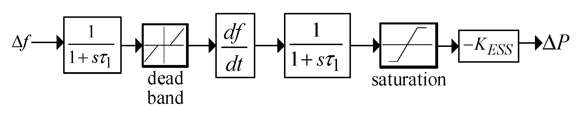 Given that the storage capacity in microgrids is constrained by power electronic hardware, the energy storage system in this study is assumed to provide inertial response only. Virtual inertia control enables the ESS to emulate the inertial behavior of synchronous generators, thereby increasing the system inertia time constant, reducing the rate of change in frequency, and slowing the deterioration of frequency following disturbances. A derivative-based control law is employed to operate the ESS and deliver virtual inertia support, as shown in