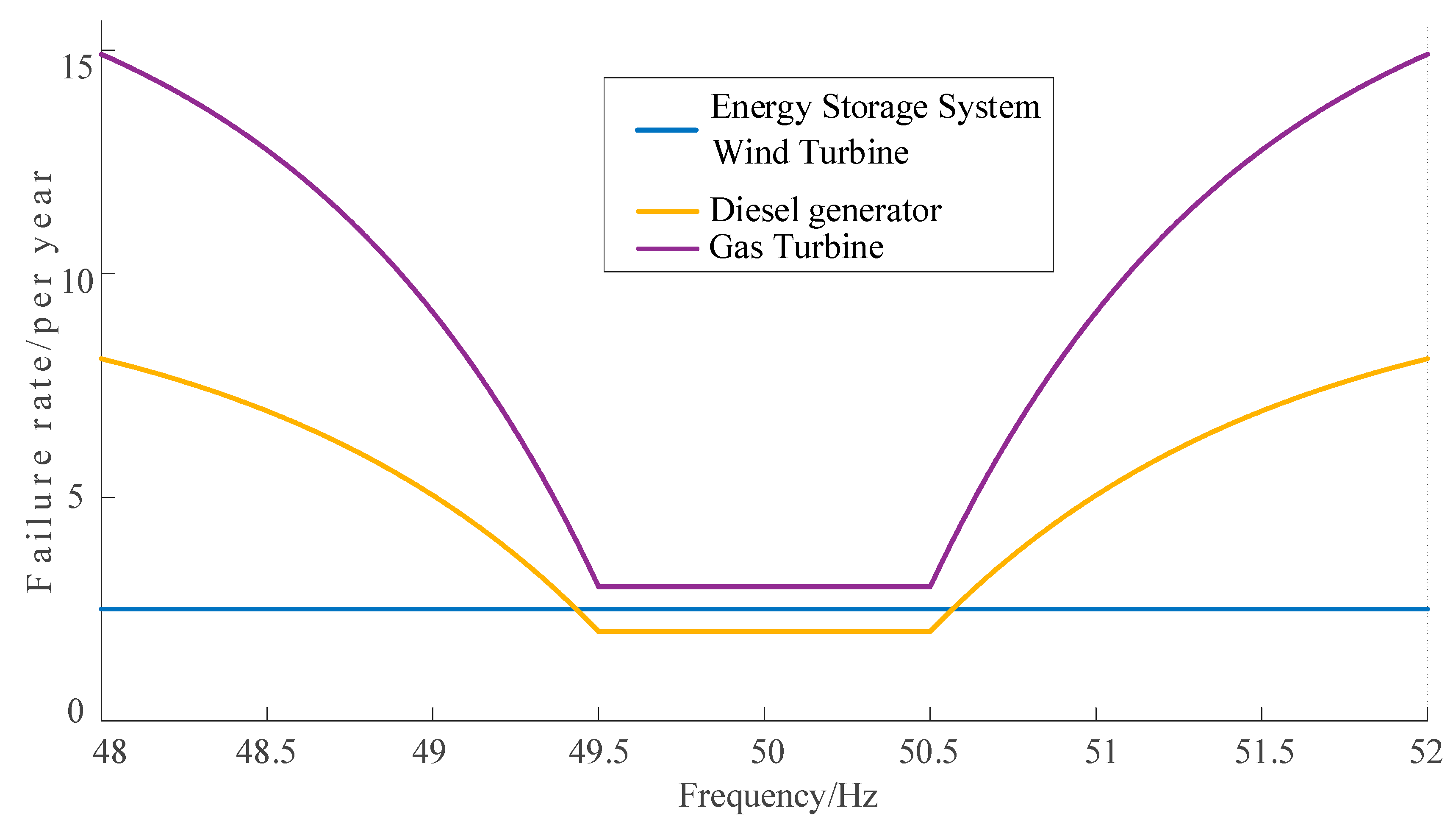 The ESS tracks the grid frequency via the inverter’s phase-locked loop (PLL). When frequency deviations become large, the control effort and switching stress increase, which may trigger overcurrent/overtemperature protection but seldom causes immediate failures. The impact of frequency deviations on the ESS primarily manifests as lifetime degradation; therefore, in this study the ESS failure rate is assumed to be independent of frequency. Likewise, wind turbine generators (WTGs) are decoupled from the microgrid through power converters and typically only invoke power-limiting or shutdown protections under large frequency excursions; hence, the WTG failure rate is also assumed frequency-independent. In other words, for converter-interfaced units such as WTGs and ESSs, we assume frequency-independent failure rates in view of their decoupling characteristics.