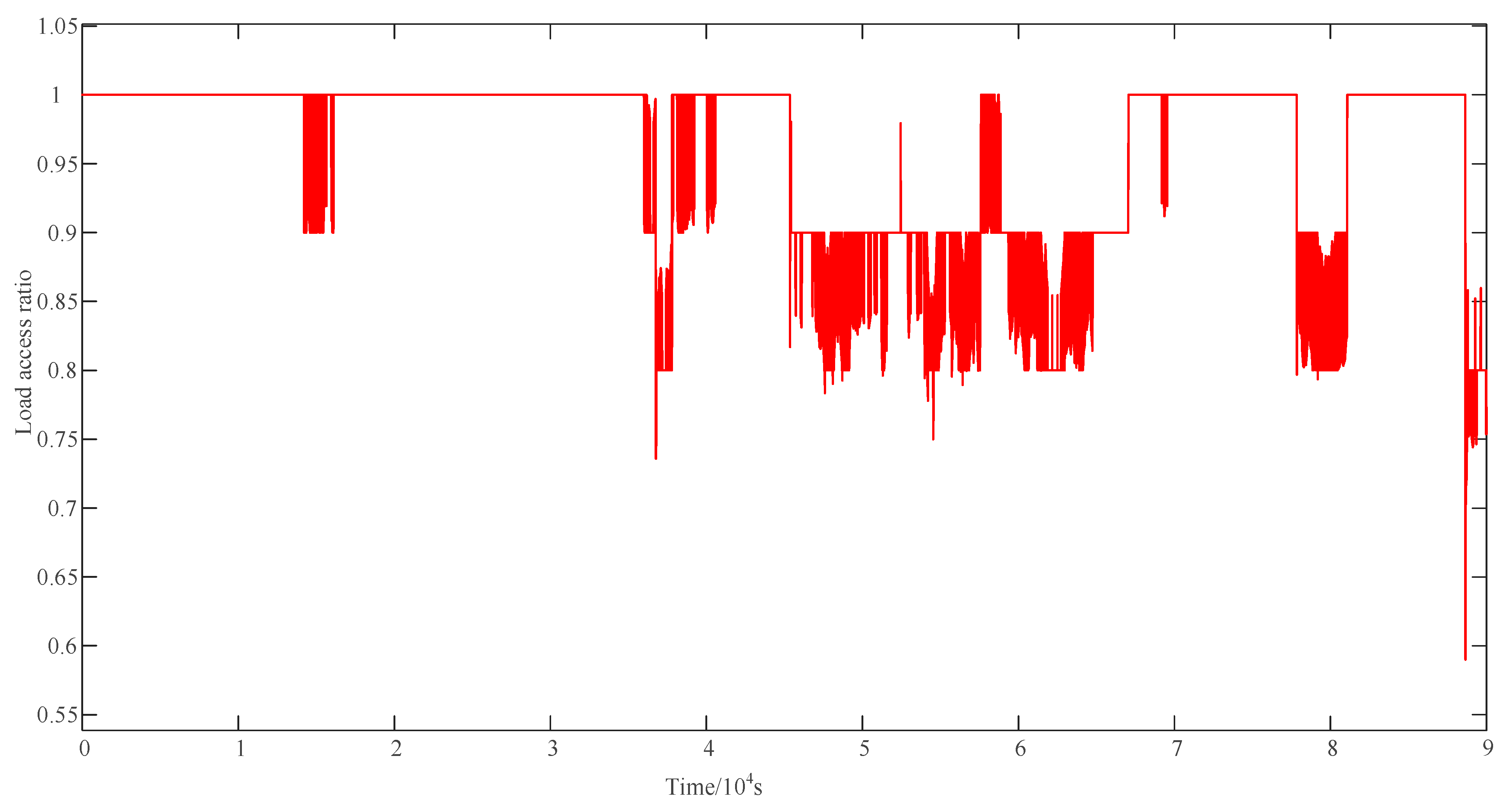 During 45,000–58,000 s, 10–20% of the load is shed for an extended period, with the frequency confined to 48.5–49 Hz. In this interval, three WTGs are out of service, so renewable output is limited, while the nominally required load is 27–33 MW—exceeding the maximum output of the diesel generators and gas turbine. The lack of supplemental renewable power prevents the microgrid from actively restoring frequency to the normal range. For most of the time, WTG output can supplement that of synchronous units; however, during load peaks, when the synchronous units are at their limits and WTGs cannot supply the excess demand, the microgrid must shed load to ensure security. After 65,000 s, an ESS failure leads to a low-frequency event around 80,000 s, similar to the case of WTG outages.
