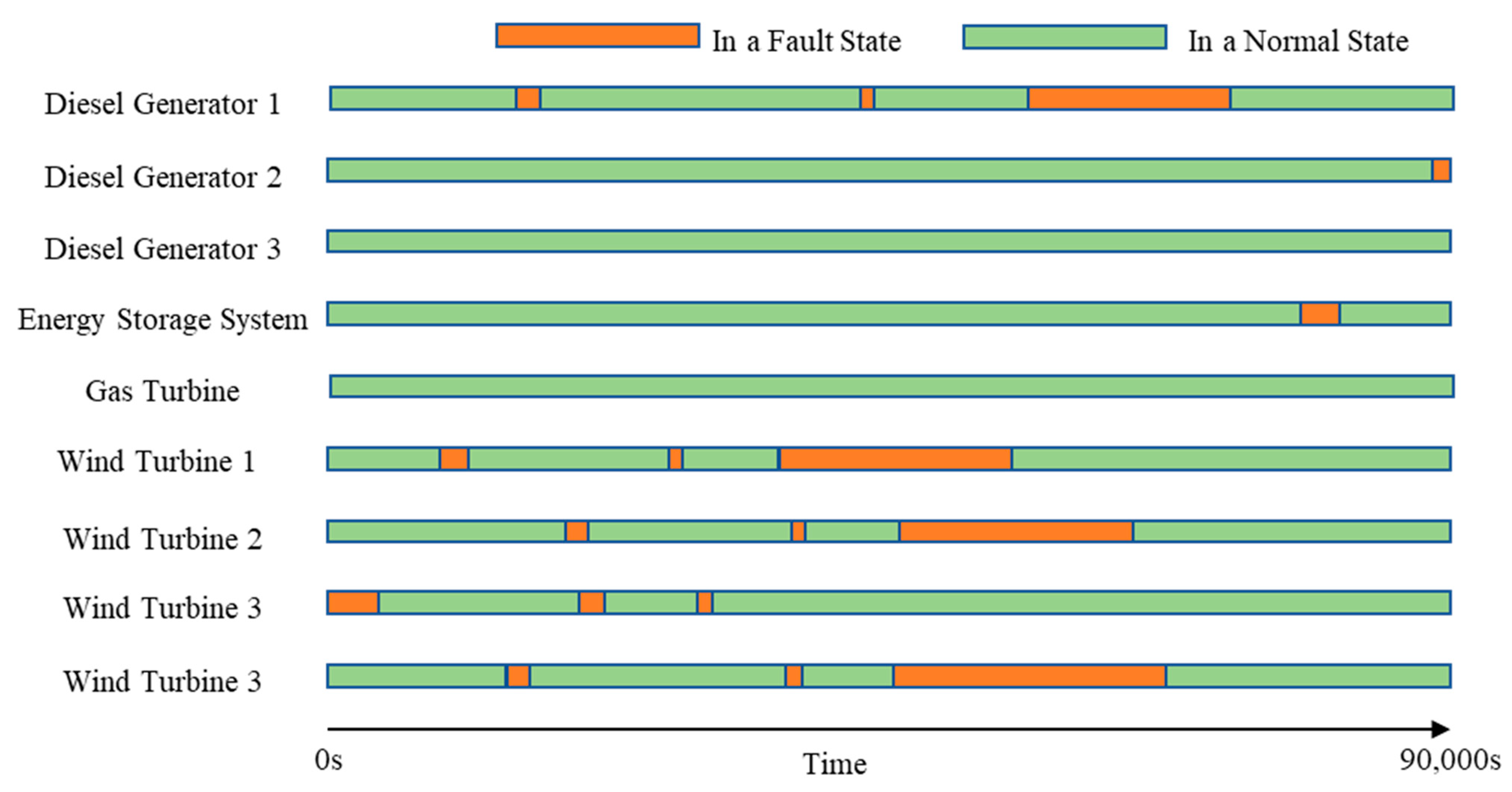 To verify the correctness and effectiveness of the proposed SFR model, a 90,000 s time-domain simulation is performed for the islanded microgrid configured above. In this subsection, both failure and repair rates are increased by a factor of 100 to accentuate the impact of unit state transitions.