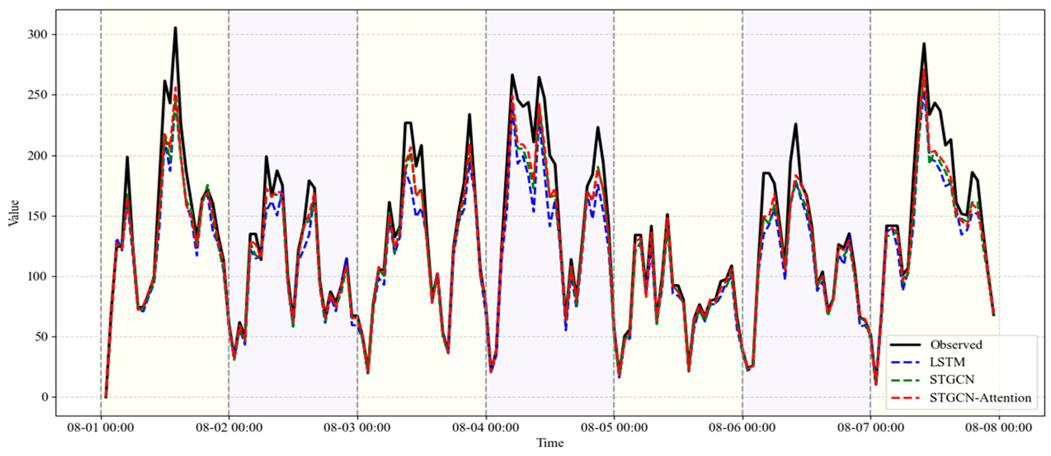 - Guo, S.; Lin, Y.; Feng, N.; Song, C.; Wan, H. Attention Based Spatial-Temporal Graph Convolutional Networks for Traffic Flow Forecasting. In Proceedings of the National Conference on Artificial Intelligence. Association for the Advancement of Artificial Intelligence (AAAI), Honolulu, HI, USA, 27 January 2019; pp. 922–929. [Google Scholar]