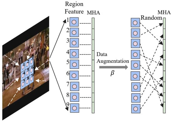 In Figure 2, frame images undergo feature extraction to generate a region feature map, which is then arranged sequentially from left to right and top to bottom. represents the probability controlling the feature data augmentation. During the training, if the value generated by a random probability seed is less than , data augmentation is applied. This shuffles the order of region feature vectors in each frame image, mapping each feature vector to different attention heads for attention calculation. If the value is greater than or equal to , the original data order is maintained. This approach effectively increases the diversity of training samples.