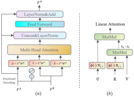 Figure 3a represents the encoder structure, denotes frame-level features extracted from anchor videos, and refers to frame-level features from positive and negative sample videos. The model first encodes positional and temporal information of input features, then passes through MHA, layer normalization, and feed-forward network layers. Figure 3b illustrates the linear attention mechanism used in the multi-head attention layer. and denote the replacement functions and rotational positional encoding methods. Specifically, in [] and denotes rotary matrix in []. This transformation enhances model training efficiency by focusing on complexity in terms of feature dimensions.
