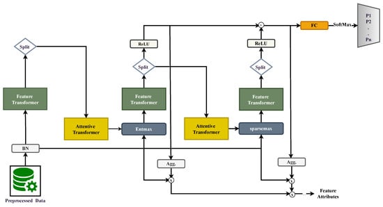 TabNet aggregates decisions across steps and maps the sum to class probabilities by a linear layer followed by softmax: