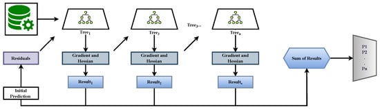 As illustrated in Figure 2, training begins from the initial margins, the residuals (gradients and Hessians) guide each tree fit, the tree outputs update the running margins, and the final ensemble output is converted to probabilities.