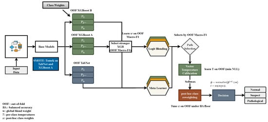 After training the base learners, we fuse their class probabilities using a dual-path strategy. The first path is a lightweight meta-learner that trains a multinomial Elastic-Net logistic regression on engineered meta-features derived solely from base predictions, including raw probabilities, Shannon entropy, top-2 class margins, and pairwise agreement indicators, and the second path is a Calibrated Global Logit Fusion that blends TabNet and the superior XGBoost stream by summing their logits with a single global weight. For probability reliability, both paths apply per-class vector–temperature calibration learned from OOF predictions; this is followed by constrained per-class reweighting, where post hoc thresholds are adjusted under a balanced-accuracy floor to ensure that sensitivity to the pathological class is not reduced relative to the best standalone base learner. Between the two fusion paths (meta and blend), the deployed path is chosen based solely on out-of-fold performance under this constraint, and the selected parameters are then applied once to the corresponding held-out outer fold.