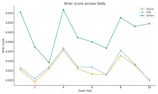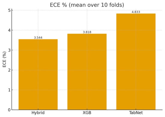 It can be observed that CGLF improved absolute calibration, achieving the best Brier score () and the second-best ECE (3.54%) among all models (Table 3). Figure 4 compares the mean ECE, and Figure 5 shows that CGLF’s per-fold Brier loss was lower than XGBoost’s in 9/10 outer folds (means reported in the caption). Together, Table 3 and Figure 4 and Figure 5 indicate that CGLF delivered more reliable probabilities without sacrificing discrimination.
