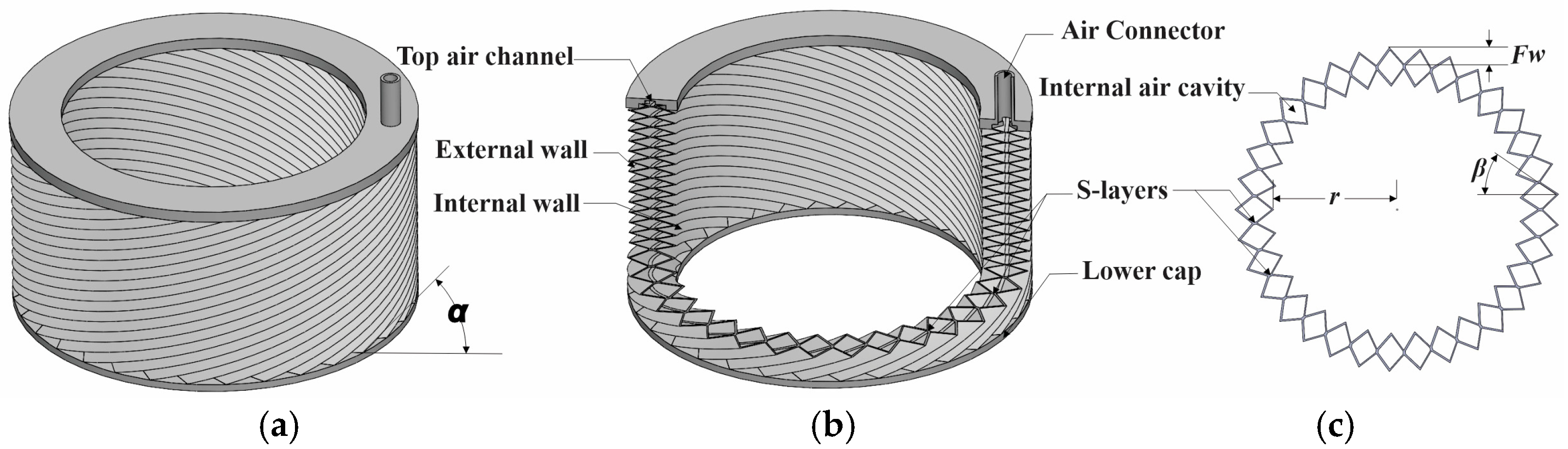 FW), defined as the horizontal distance between the peaks and valleys of the bellows corrugations, critically influences the actuator’s achievable twisting angle under positive pressure. Additionally, the helix angle (α) directly correlates with the rotational range, with larger angles facilitating increased twisting motion. The wall thickness (