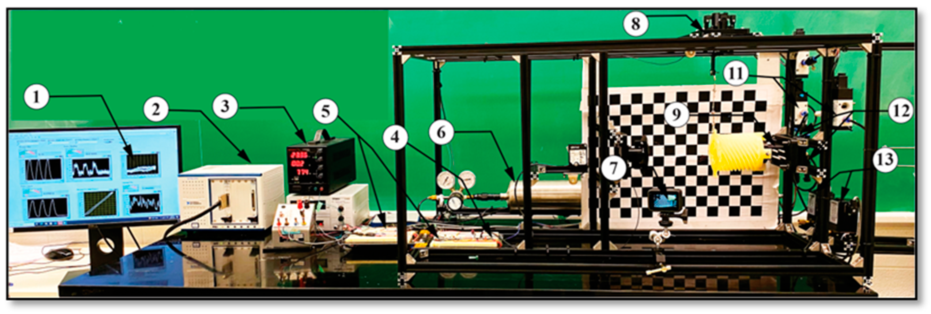 Finally, sensor-generated signals are captured and processed using a National Instruments Data Acquisition System (NI PXIe-1073) in combination with LabVIEW 18 software. This integrated system converts raw sensor signals into meaningful, real-time visual representations, such as graphs and charts. These visualizations facilitate continuous monitoring of actuator performance, enabling timely and informed adjustments during experimental trials and ensuring high-quality data collection for subsequent analyses.
