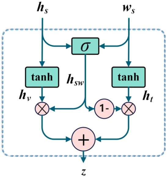 where and are intermediate vectors from and using . comes from concatenating and (making a -dimensional vector) and applying to get an -dimensional vector. is computed by element-wise multiplication (denoted by ) and addition. Finally, and are the gating unit outputs.