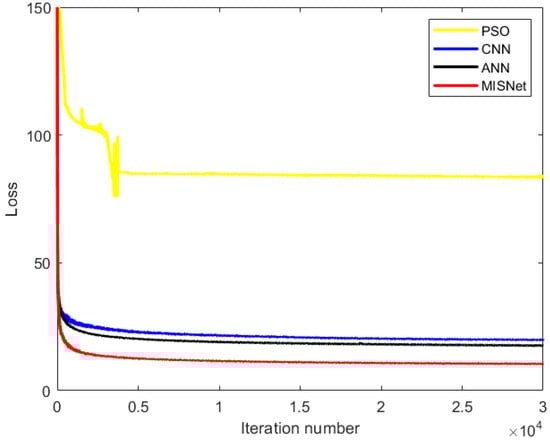 To verify the convergence performance of the MISNet algorithm in multi-interference environments, we compare the loss function convergence characteristics of different algorithms under the combined action of ISRJ and ISRJ-RF dual interference sources. Figure 3 shows the training convergence curves of four algorithms: PSO, CNN, ANN, and MISNet.