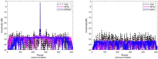 Figure 4a shows the waveform autocorrelation function characteristics designed by the three algorithms. It can be observed that the MISNet algorithm achieves the lowest sidelobe level near the main peak, effectively suppressing autocorrelation sidelobes. Figure 4b displays the cross-correlation function between the interference signal and the receive filter. Compared to other algorithms, the MISNet algorithm maintains lower cross-correlation levels across the entire range, demonstrating excellent interference suppression capability.