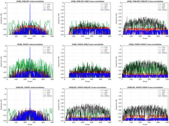 From Figure 5, it can be observed that in multi-interference environments, the MISNet algorithm maintains good sidelobe suppression characteristics near the main peak of the autocorrelation function while achieving the lowest correlation levels in the cross-correlation functions of both interference sources. In contrast, other algorithms show obvious performance degradation when handling multiple interferences.