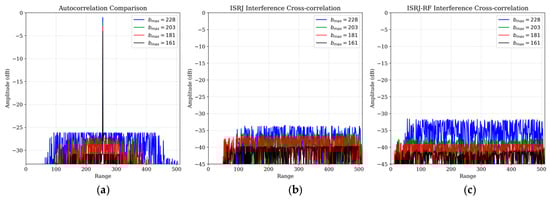 Correlation function comparison under different values. (a) Autocorrelation function; (b) ISRJ interference cross-correlation function; (c) ISRJ-RF interference cross-correlation function.