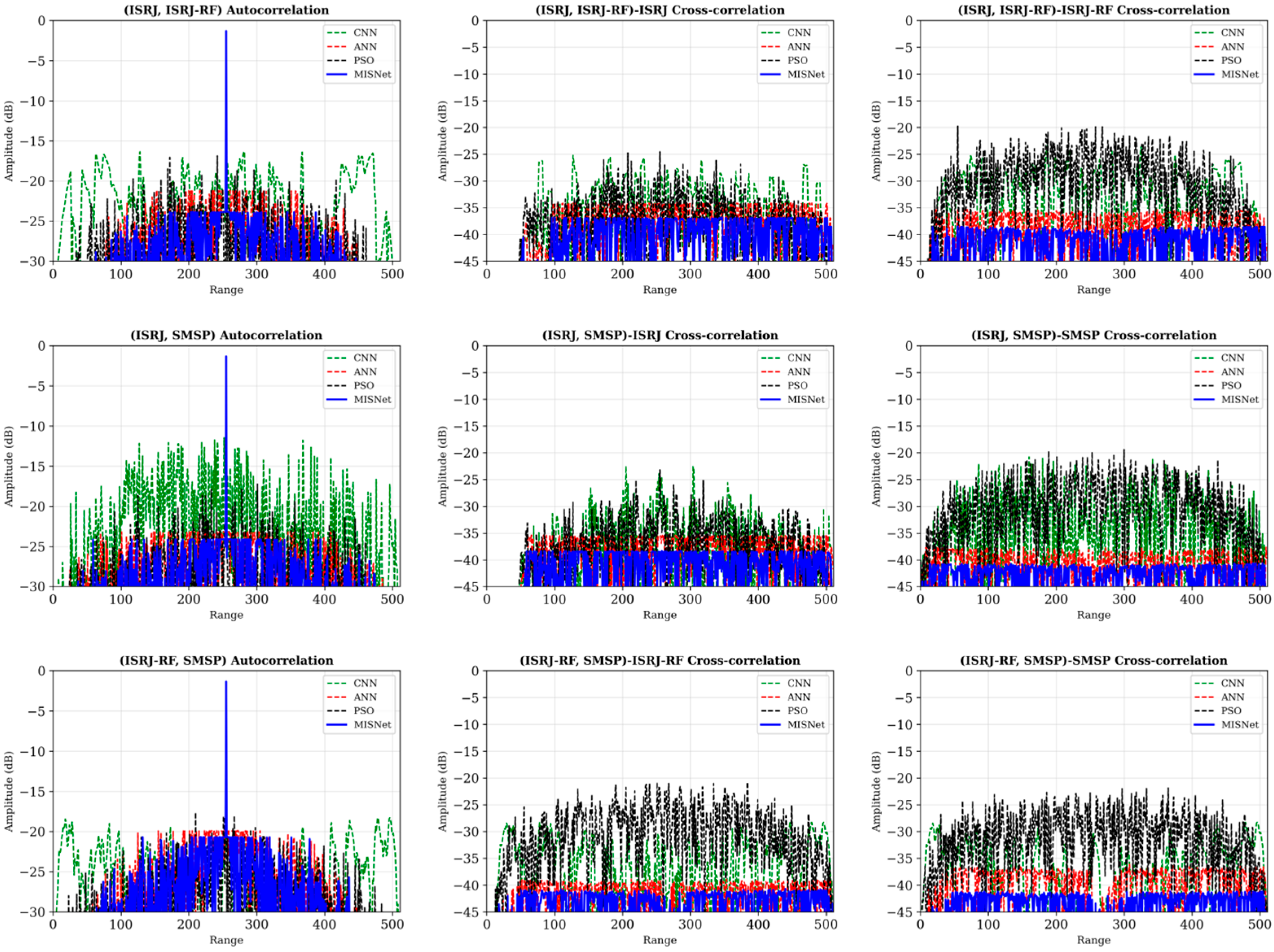 Figure 5, it can be observed that in multi-interference environments, the MISNet algorithm maintains good sidelobe suppression characteristics near the main peak of the autocorrelation function while achieving the lowest correlation levels in the cross-correlation functions of both interference sources. In contrast, other algorithms show obvious performance degradation when handling multiple interferences.
