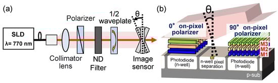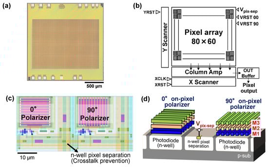 - Okada, R.; Sasagawa, K.; Mizuno, M.; Takehara, H.; Haruta, M.; Tashiro, H.; Ohta, J. Improvement of on-pixel polarizer with 0.35 µm CMOS process for electro-optic imaging systems. Jpn. J. Appl. Phys. 2023, 62, SC1052. [Google Scholar] [CrossRef]