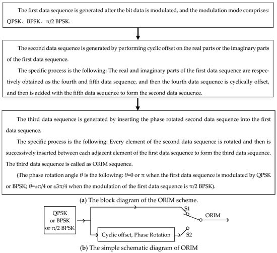 This process can also be described by the diagram in Figure 1b, where switches S1 and S2 are used to generate the odd and even symbols of data, respectively. Specifically, S1 corresponds to the first line of Equation (1) and is used to generate the original modulation data (QPSK, BPSK, or π/2-BPSK), whereas S2 corresponds to the second line of Equation (1) and generates the data after cyclic offset and phase rotation. The final ORIM is then obtained by inserting the even symbols into the sequence of odd symbols. Algorithm 1 summarizes the detailed process by which ORIM generates data.