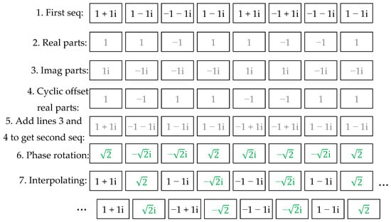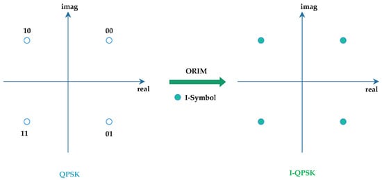Figure 3 presents a schematic diagram of I-QPSK generation, where the issue of power was ignored for convenience. It can be observed that because the I-QPSK generation process can ensure that two adjacent symbols have the same real part or imaginary part, the phase variations between adjacent symbols in I-QPSK are either 0 or π/2, whereas in conventional QPSK, the phase variations can be 0, π/2, or π. This illustrates that ORIM can effectively reduce the phase variations between adjacent symbols, thereby lowering the PAPR.