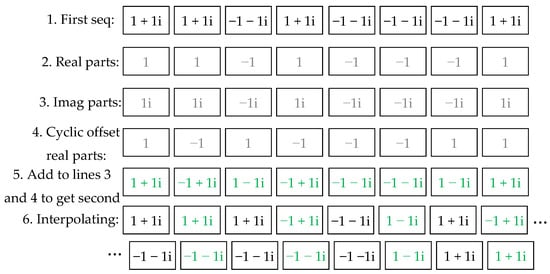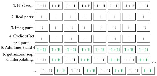The above process can be summarized as generating s(m) according to Equation (1), m = 1, 2, 3,…, M, where M is the number of elements in the s(m) sequence. The C(n) sequence is the data sequence of QPSK, BPSK, and π/2 BPSK modulation, i.e., the first data sequence, n = 1, 2, 3,…, N, where N is the number of elements in the C(n) sequence, and M = 2N. Where “real(·)” represents taking the real part, “imag(·)” represents taking the imaginary part, and θ(m) is the rotating phase. In the formula for generating s(M), C(N + 1) is the first data in the C(n) sequence, i.e., C(N + 1) = C(1). Equation (1) is to take the imaginary part of the former symbol and the real part of the latter symbol, and can also be reversed, that is, to take the real part of the former symbol and the imaginary part of the latter symbol.