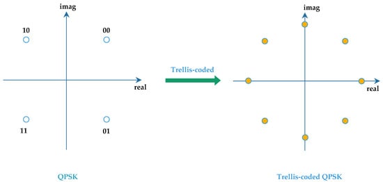 It should be noted that the trellis-coded QPSK mentioned in [] and the proposed I-QPSK in this article are two different modulation methods. In simple terms, it can be observed from the constellation diagram of trellis-coded QPSK, as shown in Figure 4, that it contains 8 different constellation points, while the proposed I-QPSK only has 4 different constellation points.