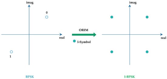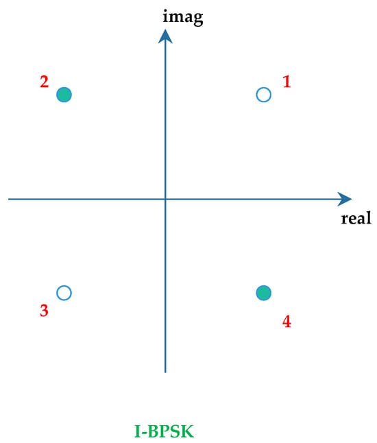 Figure 6 presents a schematic diagram of I-BPSK generation, where the issue of power was ignored for convenience. It can be observed that because the I-BPSK generation process can ensure that two adjacent symbols have the same real part or imaginary part, the phase variations between adjacent symbols in I-BPSK are either 0 or π/2, whereas in conventional BPSK, the phase variations can be 0 or π. This illustrates that ORIM can effectively reduce the phase variations between adjacent symbols, thereby lowering the PAPR.