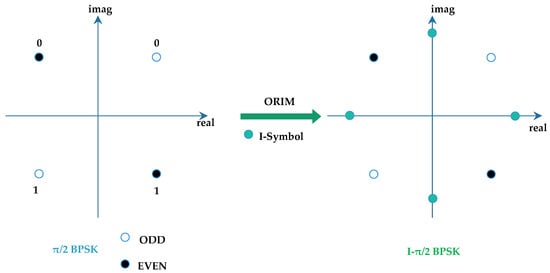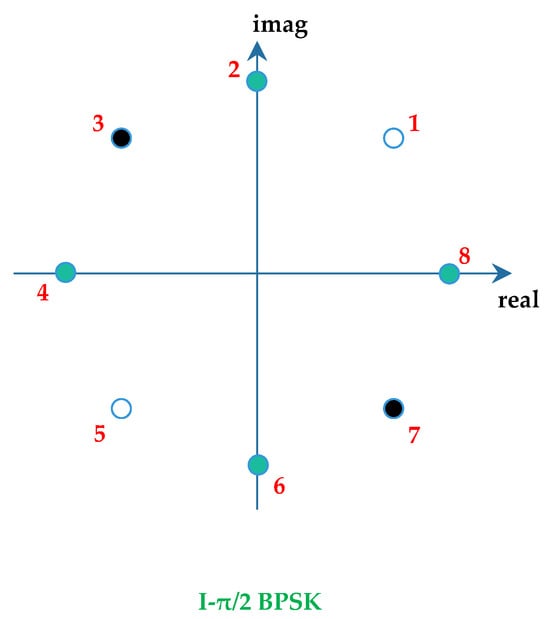 Figure 8 presents a schematic diagram of I-π/2 BPSK generation, where the issue of power was ignored for convenience. It can be observed that because the I-π/2 BPSK generation process can ensure that two adjacent symbols have the same real part or imaginary part before phase rotation, the phase variations between adjacent symbols in I-π/2 BPSK are π/4, whereas in conventional π/2 BPSK, the phase variations can be π/2. This illustrates that ORIM can effectively reduce the phase variations between adjacent symbols, thereby lowering the PAPR.