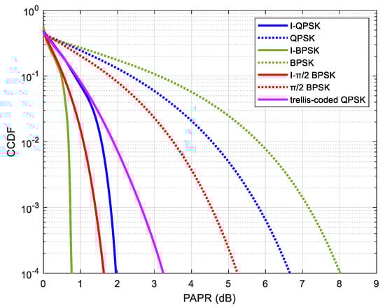The comparative simulation results of the PAPR are shown in Figure 9 for I-QPSK, I-BPSK, and I-π/2 BPSK, as well as the existing schemes of π/2 BPSK and the trellis-coded QPSK.