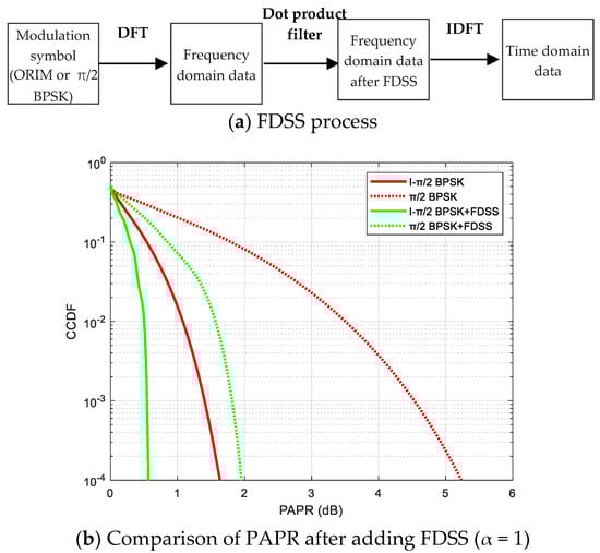 In the 5G NR implementation, a filtering operation known as FDSS can be applied to the transmitted data, which reduces the PAPR of π/2 BPSK. Therefore, in this case, we compare the PAPR of I-π/2 BPSK and π/2 BPSK with the same FDSS. The process of FDSS can be summarized as shown in Figure 10a. First, FFT is performed on the data of the modulation symbol to obtain the frequency-domain data, and then it is multiplied with a root-raised cosine (RRC) filter in the frequency domain. The bandwidth of the RRC filter is equal to the frequency-domain width of the data, and the roll-off factors α = 1 is chosen for the filter. Finally, IFFT is performed on the frequency-domain data after FDSS to obtain the time-domain data.