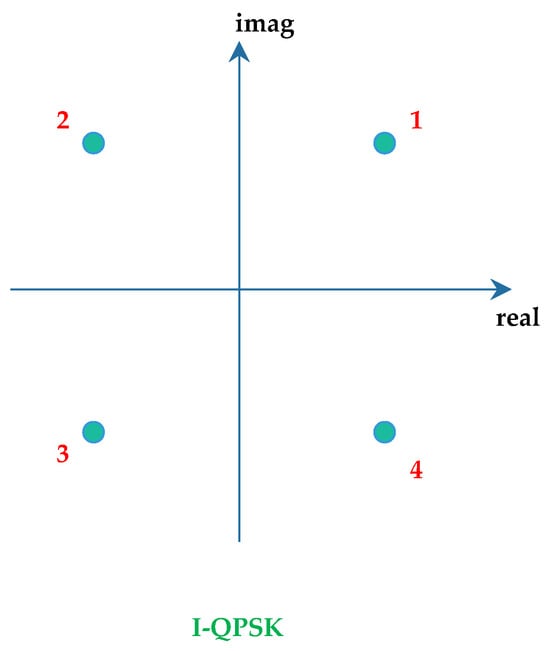 First, extract the real parts {I1, I2,…, IN} and imaginary parts {Q1, Q2,…, QN} of the first data sequence as the fourth and fifth data sequences, respectively. Then, perform a left cyclic offset on the fourth data sequence to obtain {I2, I3,…, IN, I1}. Next, add this offset sequence with the fifth data sequence to generate a second data sequence of length N: {I2 + Q1, I3 + Q2,…, IN + QN-1, I1 + QN}. In this case, we are considering θ = 0, so the phase rotation operation can be omitted. Insert these elements sequentially between adjacent elements in the first data sequence to form a third data sequence of length 2N: {I1 + Q1, I2 + Q1, I2 + Q2, I3 + Q2,…, IN + QN-1, IN + QN, I1 + QN}. This results in an I-QPSK modulated data sequence. It is worth noting that the interpolation results of I-QPSK can be generated based on left or right cyclic offset of the real part, and these two schemes have the same performance and PAPR. The example provided in this article is a left cyclic offset; this is equivalent to (1 + D) π/2 BPSK in article [], but the right cyclic offset is not. The constellation diagram for I-QPSK is shown in Figure 2. The odd symbols of I-QPSK are the QPSK symbols, the even symbols are obtained by QPSK cyclic offset and phase rotation, and the constellation diagram is exactly these four points, so the constellation diagram after interpolation is the same as the constellation diagram of QPSK. However, the generation process and meaning of constellation points of even symbols and constellation points of QPSK are different.