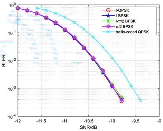 In the case of the AWGN channel with ideal channel estimation, as shown in Figure 14, simulation results indicate that the performance of the first four modulation schemes is similar, proving that ORIM does not compromise BLER performance even with a lower PAPR advantage. However, the trellis-coded QPSK exhibits slightly worse performance, and its demodulation method is more complex. Furthermore, as evidenced in Table 1, I-QPSK, I-BPSK, and I-π/2 BPSK provide significant PAPR reduction over π/2 BPSK, with CCDF at 10−4 gains of 3.2 dB, 4.5 dB, and 3.6 dB, respectively.