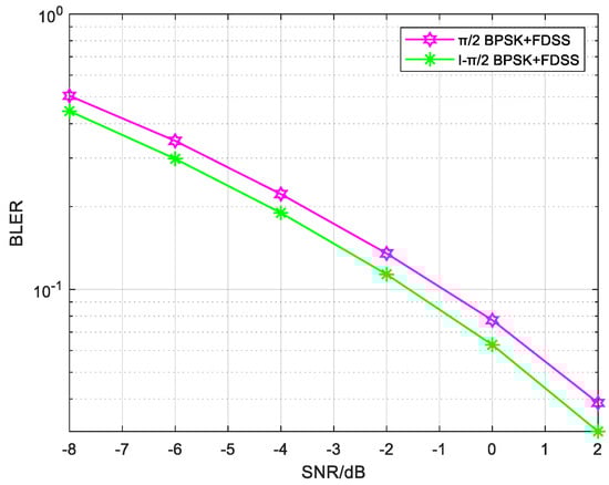 The simulation results are shown in Figure 15. It can be observed that with the addition of FDSS, I-π/2 BPSK outperforms π/2-BPSK in terms of BLER performance. Furthermore, according to the PAPR results shown in Figure 8, I-π/2 BPSK with FDSS exhibits lower PAPR compared to π/2-BPSK. This highlights the advantage of using I-π/2 BPSK over π/2-BPSK when FDSS is employed; the performance improvement is approximately 0.6 dB at BLER = 0.1.