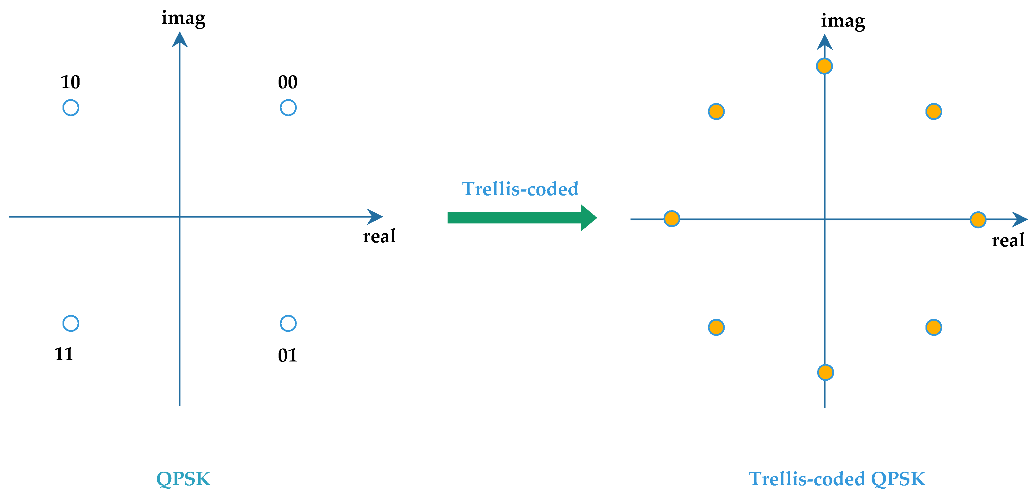 20]. In 8-BPSK, information bits are mapped onto 8-PSK constellation points using a grid-based mapping method to ensure minimal phase transitions between consecutive symbols. CPM, as a phase modulation technique, employs cumulative and instantaneous phase components to achieve near-continuous phase transitions. As a common novel modulation scheme in 5G NR proposals, trellis-coded QPSK is characterized by its low PAPR, resulting from the joint design of convolutional codes and QPSK mapping. Nevertheless, these schemes still face challenges such as degraded demodulation performance at the receiver and increased demodulation complexity, which significantly limit their practical applicability. Additionally, in [