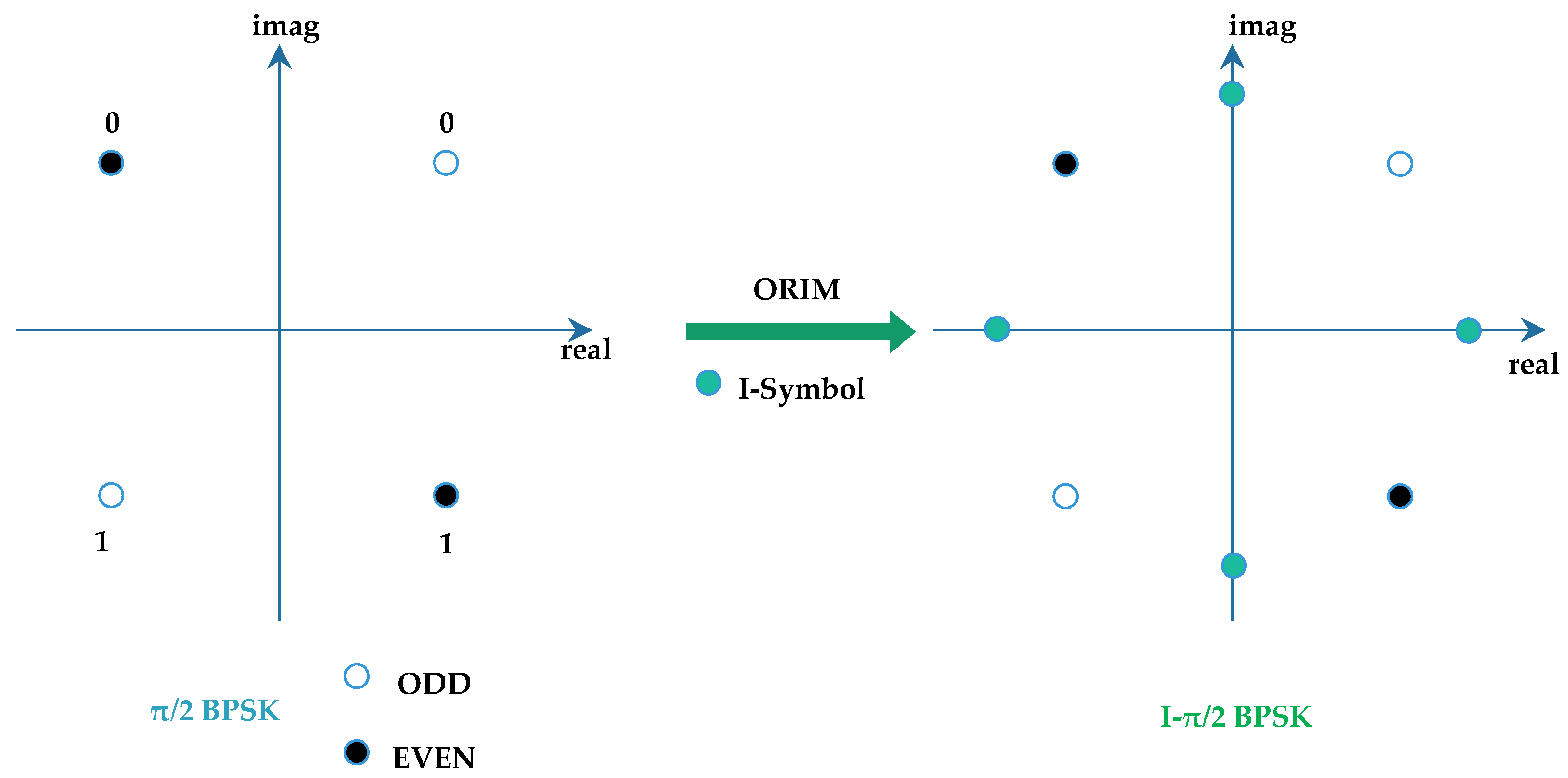 It is evident that the modulation process of the ORIM transmitter is not significantly complex compared to π/2 BPSK. Moreover, the power consumption of this component is considerably lower than that of DFT or the gains achieved through PAPR reduction.