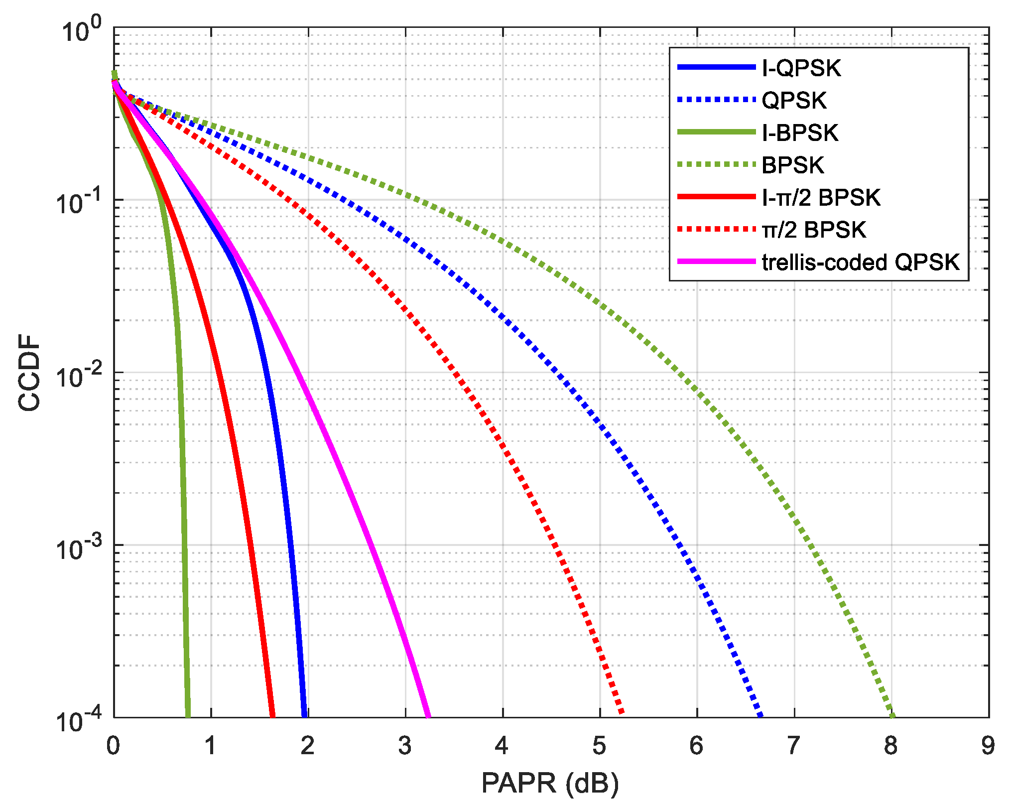 21], a (1 + D) π/2(N + 1) BPSK scheme was proposed, capable of achieving very low PAPR while preserving good demodulation performance. However, as N increases, the required code rate decreases, which limits its efficiency in high-data-rate scenarios.