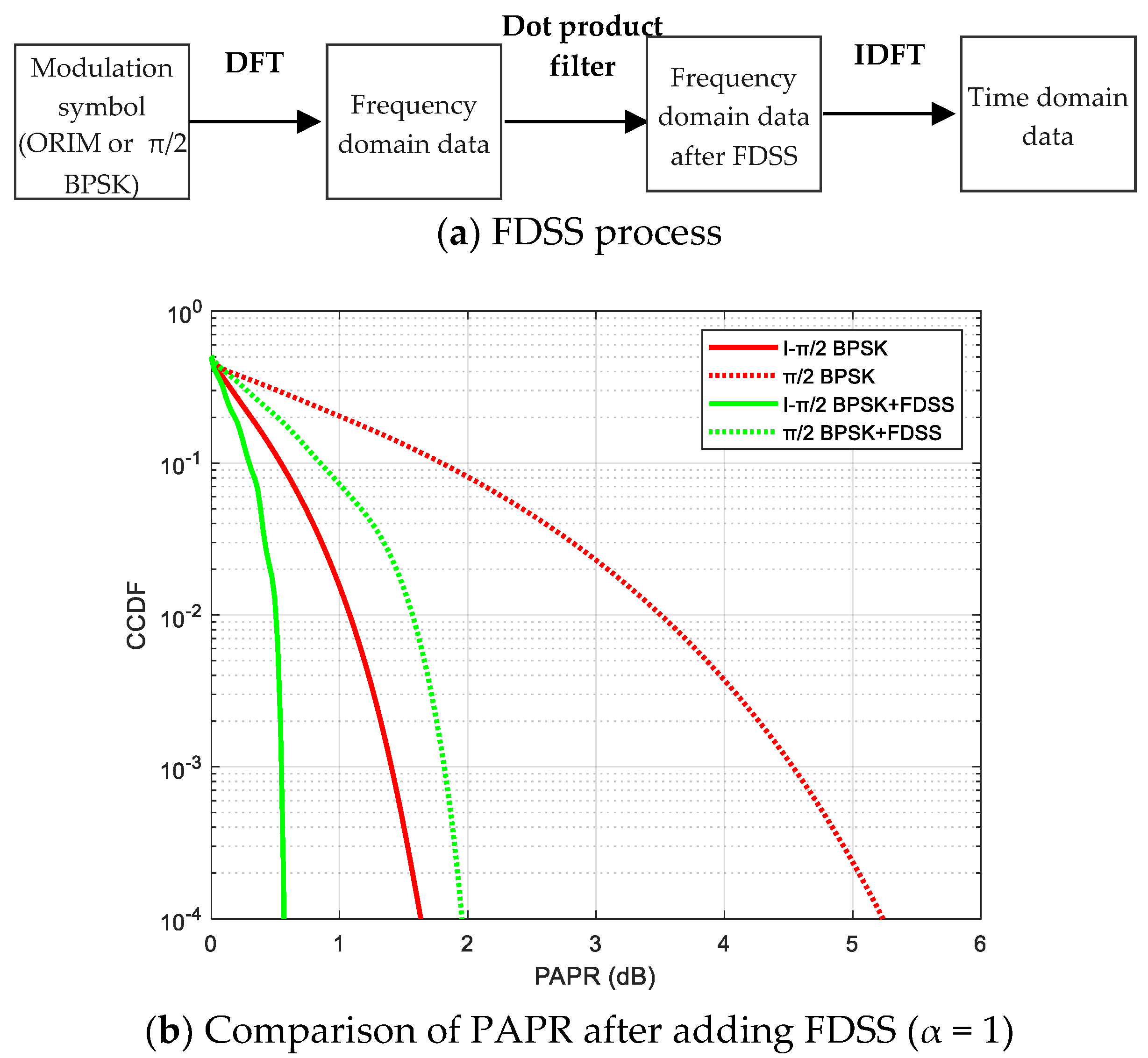 In the 5G NR implementation, a filtering operation known as FDSS can be applied to the transmitted data, which reduces the PAPR of π/2 BPSK. Therefore, in this case, we compare the PAPR of I-π/2 BPSK and π/2 BPSK with the same FDSS. The process of FDSS can be summarized as shown in