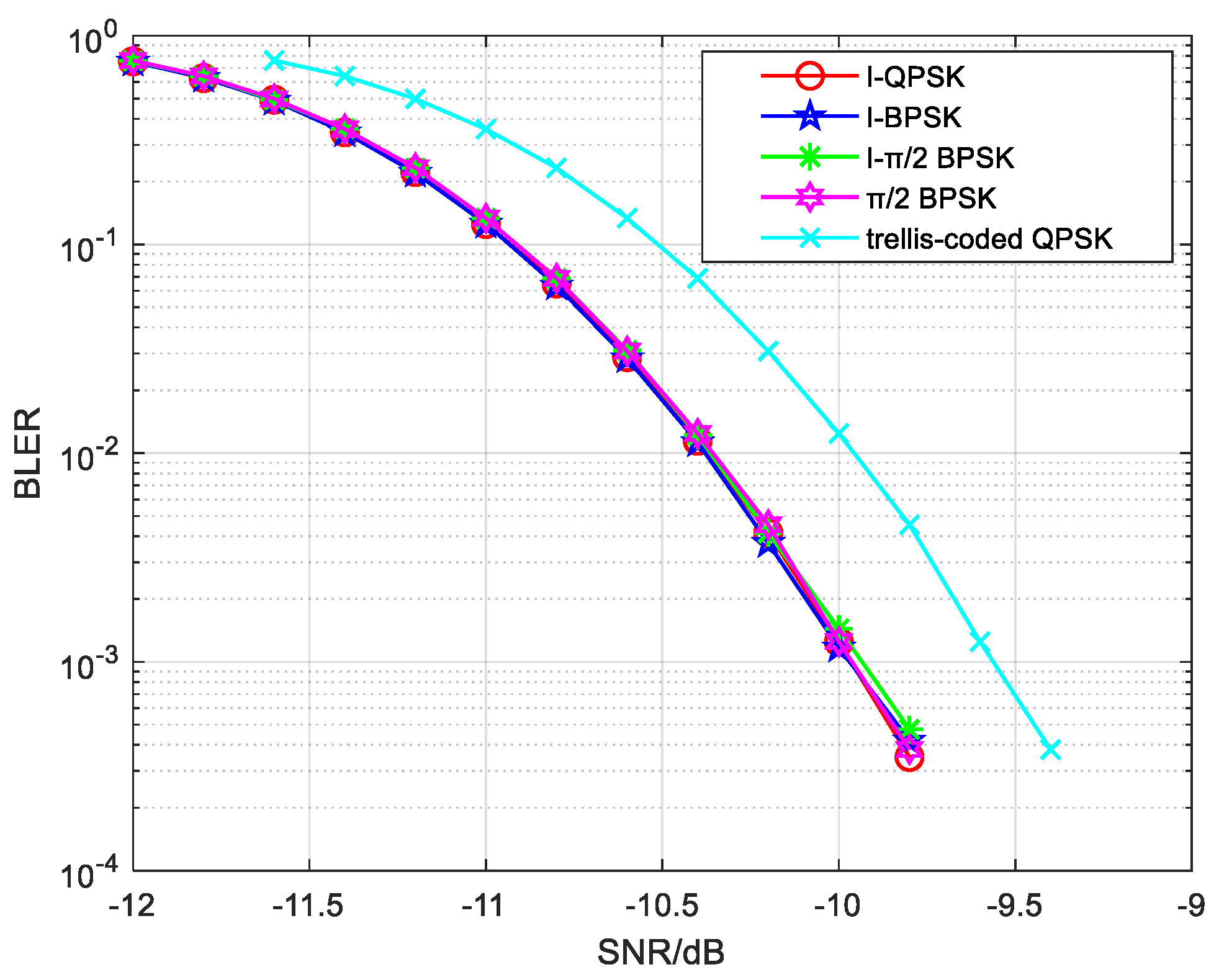 In this section, the BLER performance of three types of ORIM, π/2-BPSK, and the trellis-coded QPSK is compared and analyzed under a Single-Input Single-Output (SISO) system.