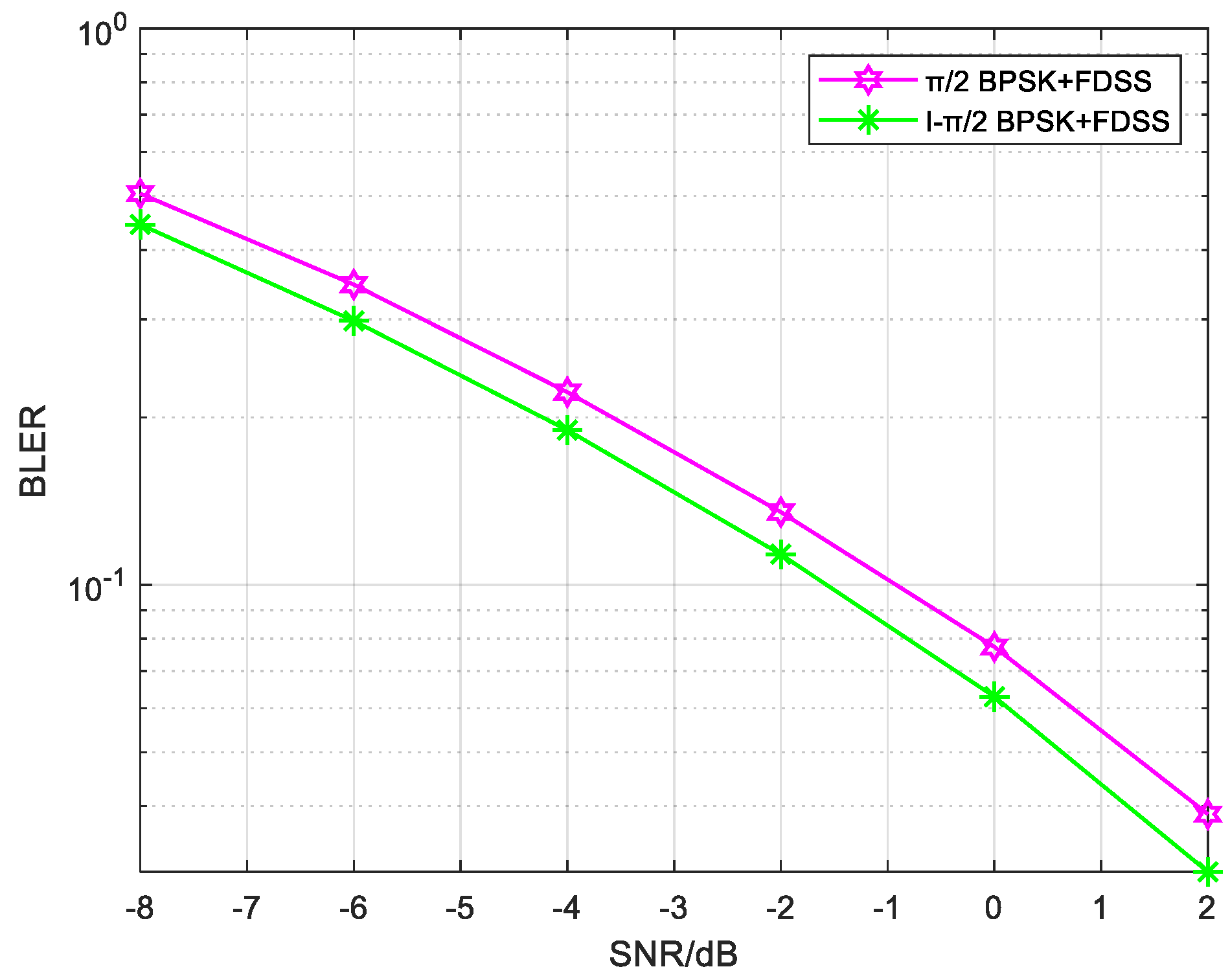 Figure 15. It can be observed that with the addition of FDSS, I-π/2 BPSK outperforms π/2-BPSK in terms of BLER performance. Furthermore, according to the PAPR results shown in